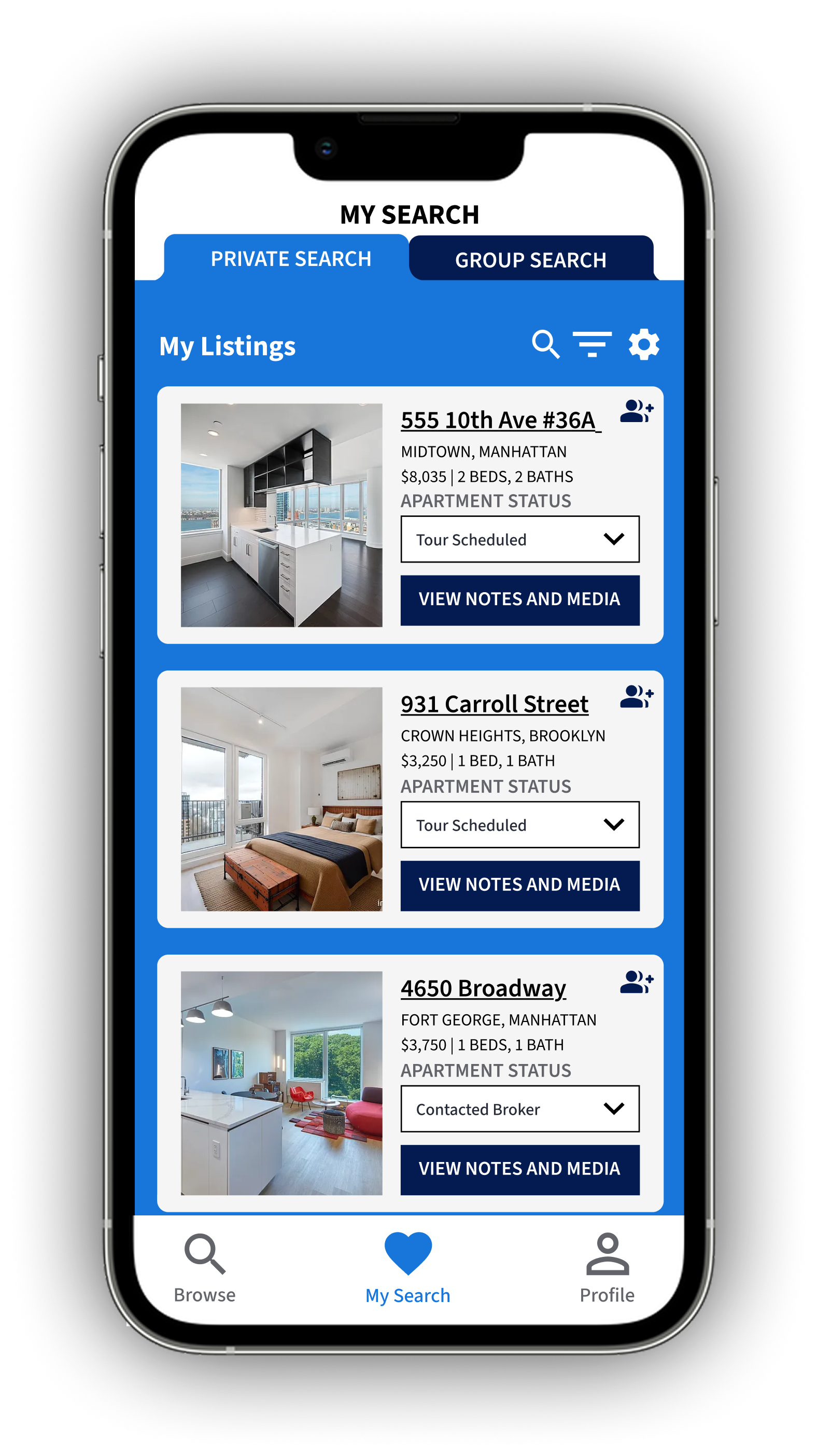 Busy New Yorkers need a better way to organize apartment listings and tours when looking for housing with roommates. It is important that this feature is accessible and easy to use so that all roommates in a group search feel comfortable navigating it.