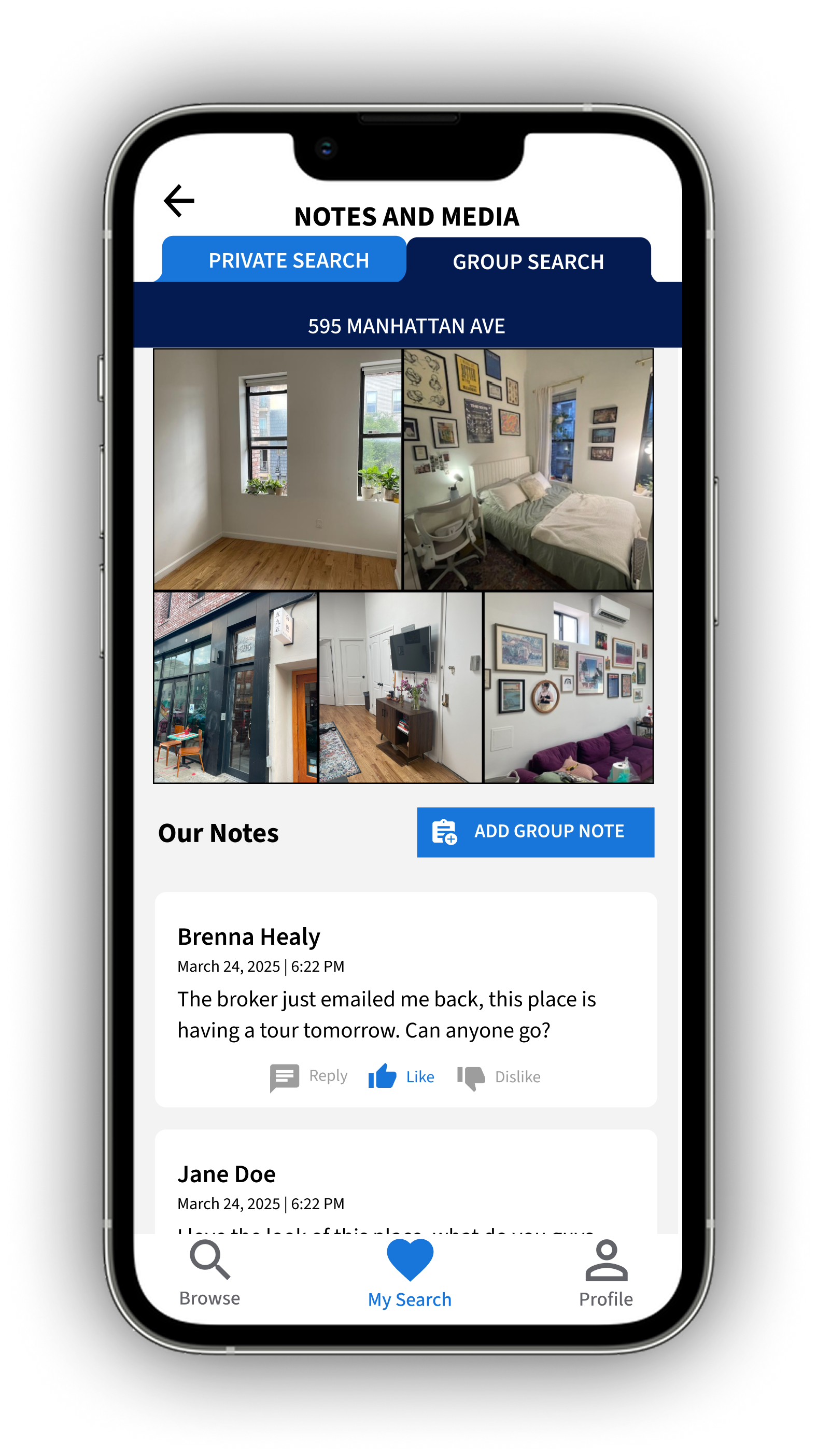 From the Group Search tab, view existing notes and media on the first listing. Add a new note/rating and upload a photo.