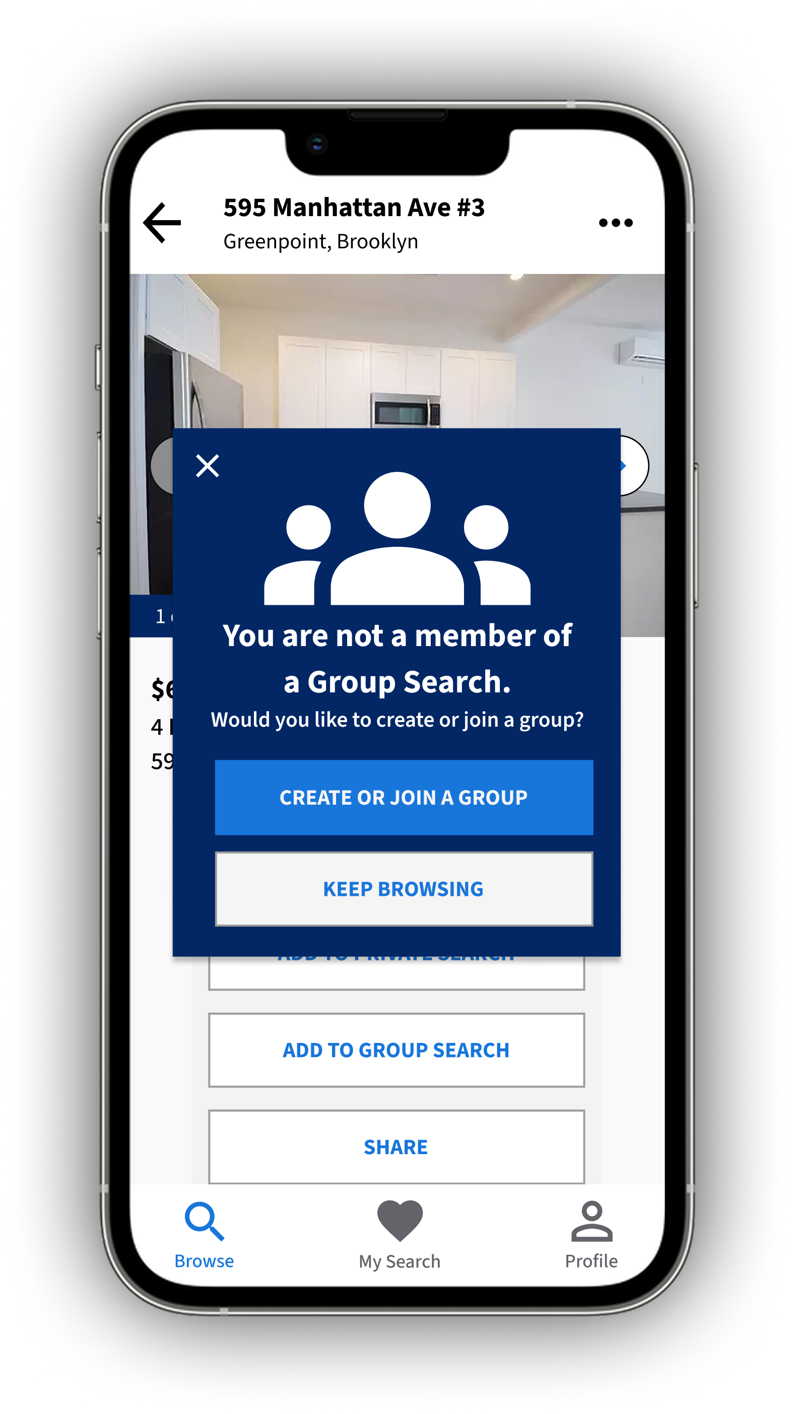 This solution addresses the key problem of searching for an apartment with roommates; on StreetEasy, there is no easy way to share and maintain a list of apartments with a group of people. By allowing users to create a group search with their roommates, they can share listings with each other directly in the StreetEasy app and keep an updated list of apartments and their status.