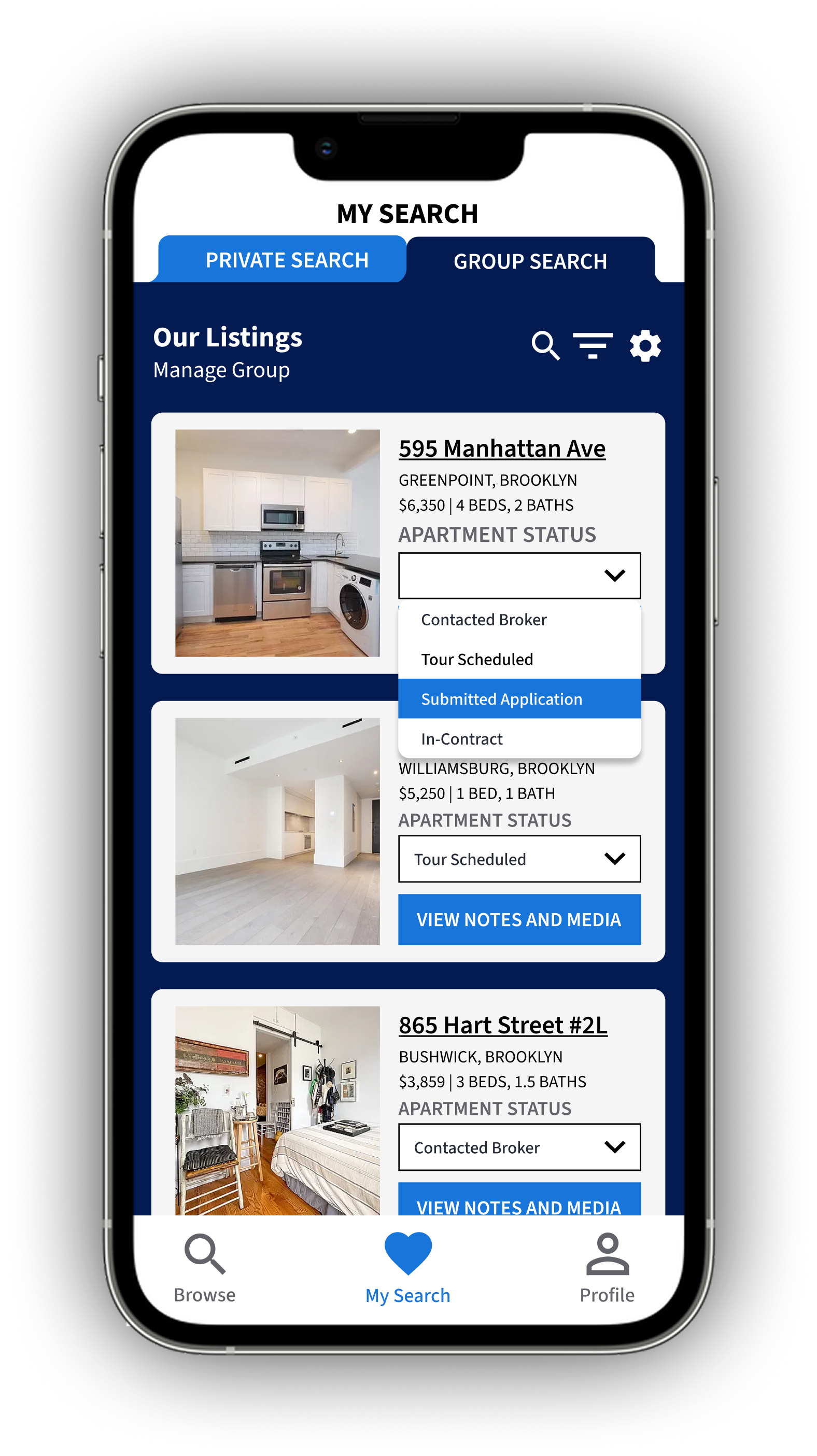 Change the status of an apartment in your group search.